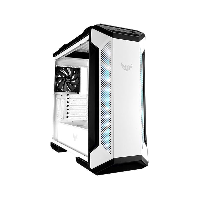 El gabinete ASUS TUF Gaming GT501 White Edition soporta placas base hasta EATX con panel frontal de metal, panel lateral de vidrio templado, ventilador RGB de 120 mm, ventilador PWM de 140 mm, espacio para radiador y USB 3.1 Gen 1. Panel frontal de metal con diseño TUF Gaming y panel lateral de vidrio templado ahumado de 4 mm para exhibir los componentes internos. Asas ergonómicas de transporte de algodón tejido que permiten un traslado fácil y seguro de hasta 30 kg. Tres ventiladores con iluminación Aura Sync RGB de 120 mm y un ventilador PWM trasero de 140 mm, con hasta siete puntos de montaje del ventilador para un flujo de aire dirigido. Espacio para radiadores de enfriamiento de agua de 360 mm en la parte delantera y superior, y un radiador de 140 mm en la parte trasera. Diseñado para placas base TUF Gaming con ubicación de ventilador y cable optimizada, listo para un control de enfriamiento a través del software Fan Xpert 4